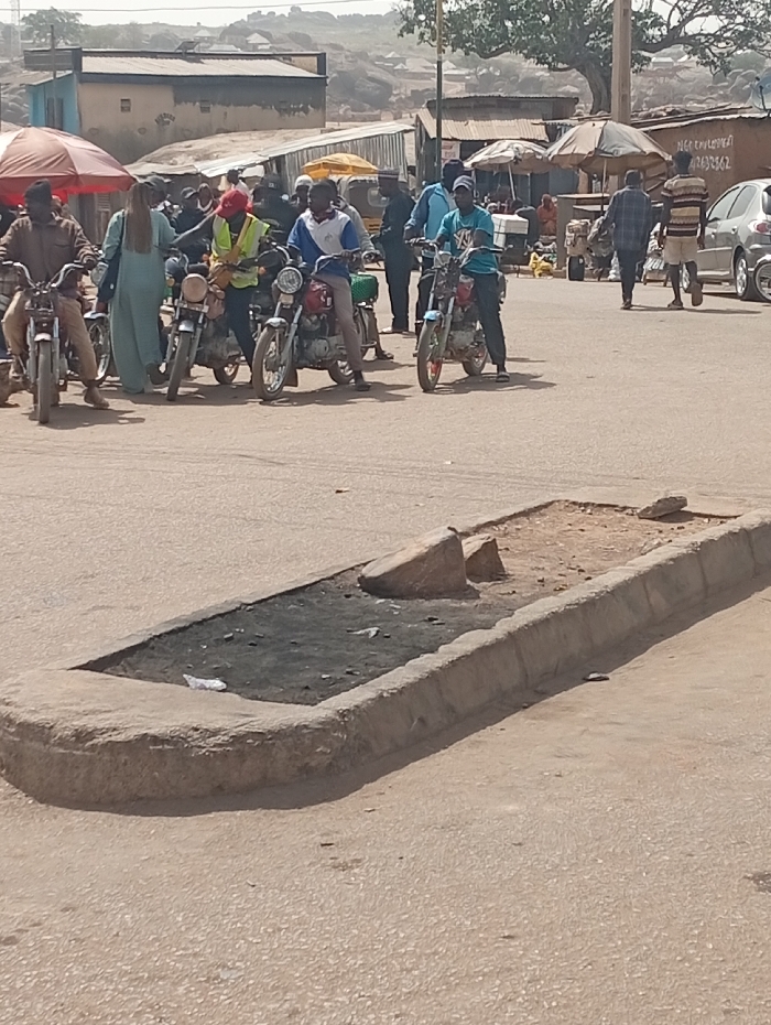 A group of people on motorcycles are at an intersection with various buildings and makeshift stalls in the background. A rectangular, concrete structure, possibly a planter or traffic island, is in the foreground. The street is arid and has a light brown color. The day appears sunny.