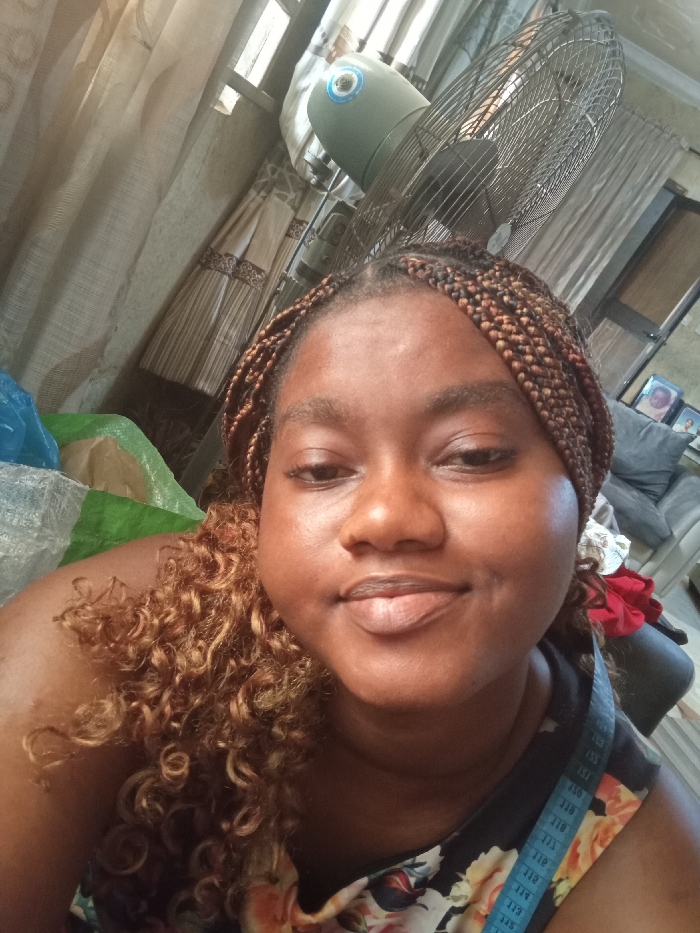 This image is a close-up indoor portrait of an individual, specified to be located in Markurdi, Nigeria. The subject is a Black female with dark skin, facing forward and looking directly at the camera. Her hair consists of tightly woven dark brown braids across the crown and top of the head, transitioning to light brown, voluminous curls on the left side of the frame. She is wearing a sleeveless top with a dark background and a prominent floral pattern featuring orange, red, and green elements. A blue and white measuring tape, displaying numerical markings (e.g., 108-122 centimeters), is draped over her right shoulder. The background elements suggest a domestic interior. To the subject's upper left, light-colored curtains with vertical stripes are partially visible, covering a window or louvered opening. Below this, a blue plastic bag, a white plastic bag, and a green woven bag are present. To the subject's upper right, a dark green standing fan with a metallic safety cage and a light blue circular emblem is situated. Further to the right and slightly lower, a portion of a dark upholstered sofa or chair is visible, partially obscured by red fabric. Above the sofa, multiple small framed items, including one appearing to be a photograph of a child, are displayed. The scene is lit, likely by natural light from the left, highlighting the subject's face.