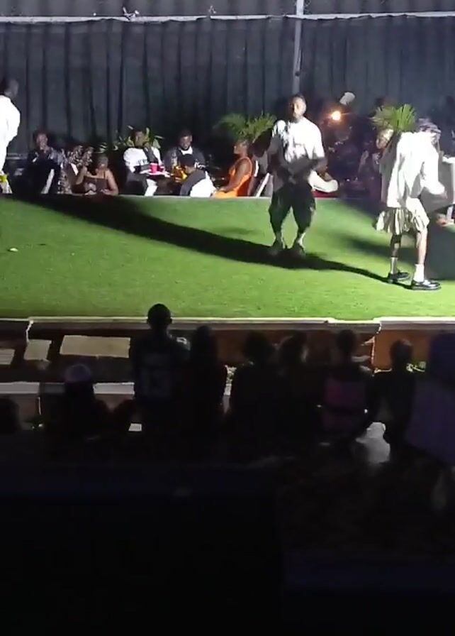 nighttime event, likely a party, with people gathered in an outdoor space. In the foreground, a group of people are seated in the dark, facing a slightly elevated stage area. The stage is covered in artificial turf, with several people standing on it. Two individuals are actively dancing and gesturing while a DJ operates equipment at a table. Additional people stand around the DJ, some recording with their phones. The audience is partially visible, their attention directed towards the performance. The environment is partially enclosed with fencing and a dark wall.
