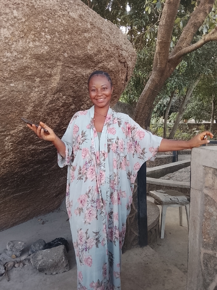 The image captures a woman standing outdoors in the city of Jos, Nigeria. She is positioned centrally, facing the camera with a direct gaze and a smile. The woman has dark skin and her hair is styled in small braids or cornrows pulled back. She is wearing a light blue, loose-fitting, long-sleeved garment, likely a kaftan or dress, patterned with pink and purple floral designs. A thin, dark-colored necklace is visible around her neck. Her right hand (viewer's left) holds a dark-colored smartphone horizontally. Her left hand (viewer's right) rests on the top surface of a light-colored, squared concrete or stone pillar. To the immediate left of the woman, a very large, irregularly shaped, light brown boulder with a rough, weathered surface occupies a significant portion of the background. To the right, a tree with a thick, textured trunk extends upwards, with some foliage visible at the top of the frame. The ground beneath the woman is composed of light-colored soil or sand, with several smaller rocks scattered to her left. Behind the concrete pillar on the right, a white plastic stool with a worn, potentially stained cushion is visible. Further into the background on the right, a low, curved wall or planter structure, constructed from stone or concrete, is partially seen. The scene is illuminated by natural daylight.