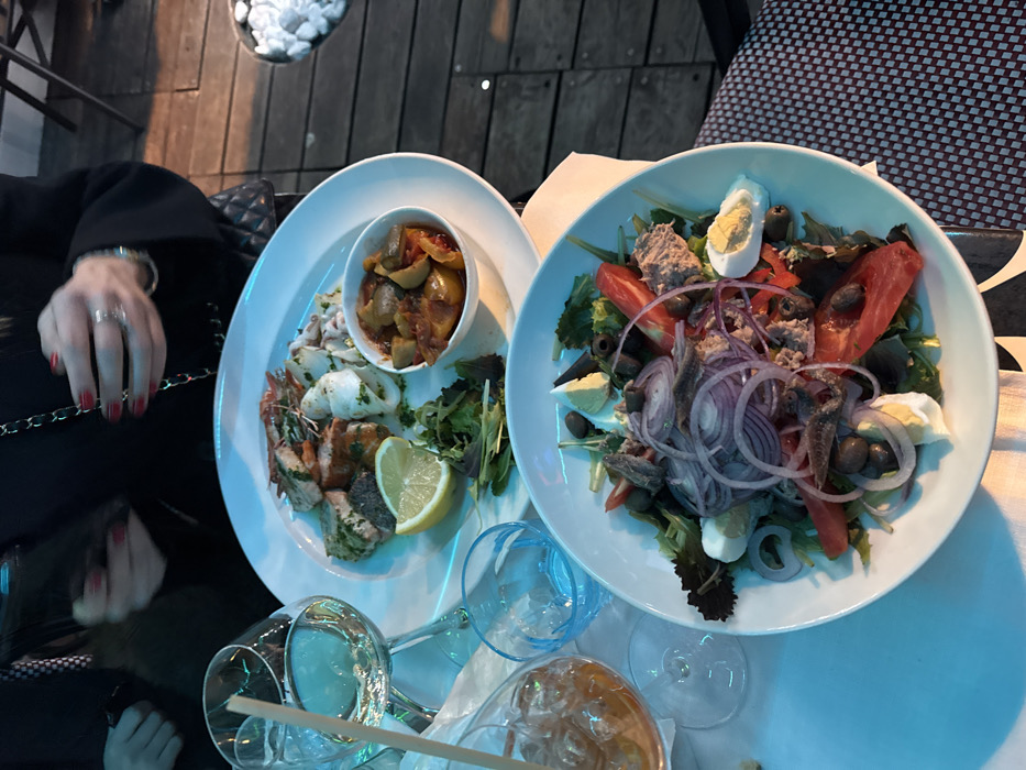 The image depicts an overhead view of a dining table at an outdoor or semi-outdoor restaurant located in Monaco, Monaco, likely in a port or marina area given the visible wooden decking. The scene is illuminated by artificial light, casting a cool, bluish hue. Two main dishes are presented on white dinnerware. The upper dish is a large oval platter containing an assortment of grilled seafood, including prawns, squid tubes, and fish fillets, accompanied by a lemon wedge and a small portion of mixed greens. A white ramekin bowl on this platter holds a side of a stewed vegetable medley. The lower dish is a white bowl containing a large salad, consistent with a Niçoise salad, featuring mixed greens, flaked tuna, sliced red onions, tomato wedges, black olives, capers, anchovy fillets, and hard-boiled egg halves. Beverages include a wine glass with white wine, a glass with an amber-colored cocktail containing ice and a wooden stirrer, and a small, empty blue glass. The table is covered with a white tablecloth. In the upper background, the hands and lower forearms of an individual are visible. This person has red nail polish, wears a silver-colored ring on the left ring finger, and is holding a dark, quilted handbag with a chain strap. The flooring consists of dark wooden planks. A portion of a patterned chair cushion is visible on the right, and a small container filled with white, irregular objects is in the far right background.