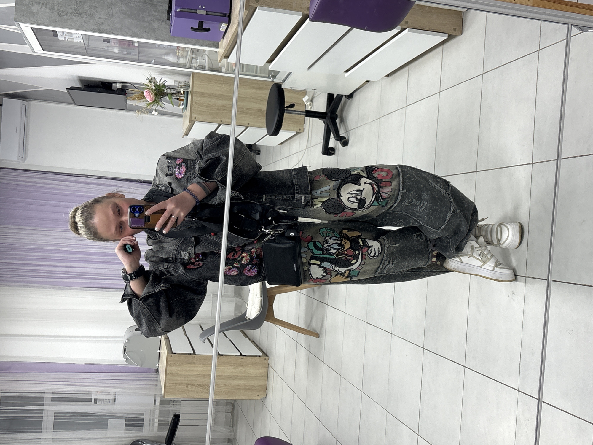 A woman is taking a selfie in a mirror. The location is Perm, Russia. She is wearing a dark denim jacket and pants with cartoon designs. Her hair is in a bun. She is holding a smartphone in her left hand. The mirror reflects a salon interior, including cabinets, a chair, and a window with white and purple curtains. The floor is tiled in white.