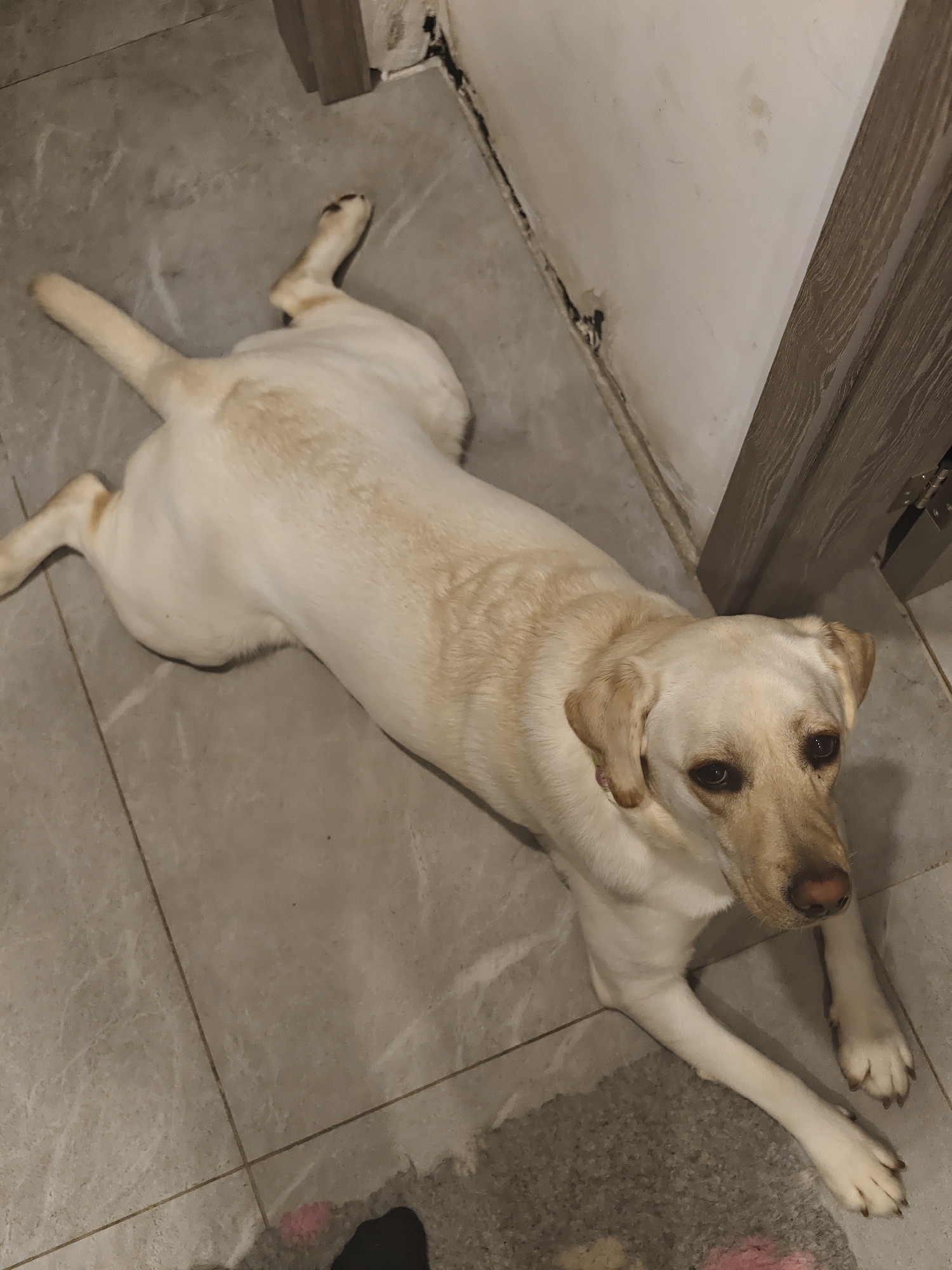 A yellow Labrador Retriever is lying on a light grey tile floor. The dog is positioned near a wall with cracked white paint and a wooden door frame. A section of patterned rug is visible in the bottom left corner. The dog is looking towards the camera. The location is potentially an interior setting in Kozloduy, Bulgaria.