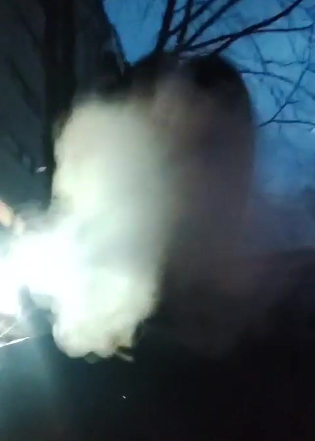 A person with dark hair, wearing a shiny black jacket, is exhaling smoke or vapor into the camera, obscuring the view. The person then lowers their jacket collar. The background includes a tree with bare branches against a blue evening sky, and a building with lit windows.