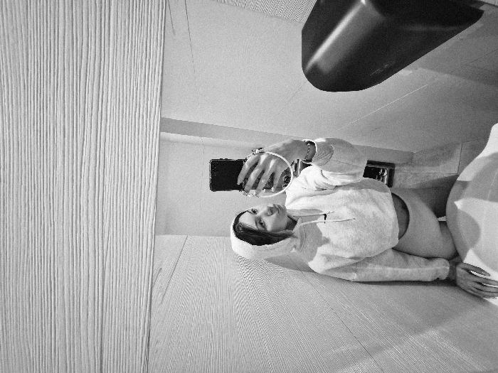 A monochromatic, eye-level mirror selfie depicts a young adult female within an indoor bathroom environment