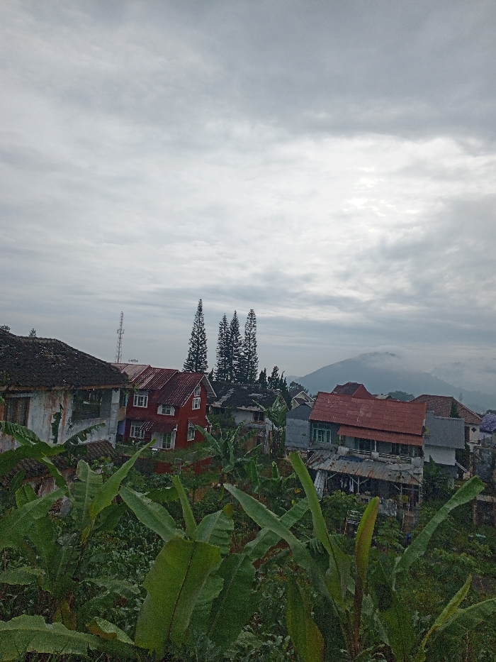 An overcast sky hangs over a collection of houses nestled among lush greenery. Buildings feature red-tiled roofs and a mix of architectural styles, some appearing aged. Dense foliage partially obscures the view, with banana plants prominently in the foreground. Tall pine trees punctuate the skyline, and a distant mountain is veiled in mist. A tall antenna tower rises among the houses, indicating human presence in the landscape.