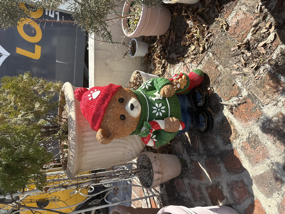 An outdoor scene in Gyeongju-si, South Korea, features a stationary, upright brown teddy bear statue. The statue is adorned with a red knitted winter hat featuring a white paw print emblem and a pom-pom, a green knitted sweater displaying white snowflake and reindeer patterns, blue jeans, and glossy black boots. It holds a red and white striped candy cane in its right hand and a red Christmas stocking, containing a gingerbread man and other small items, in its left hand. The ground surface consists of reddish-brown brick paving on the left and center, transitioning to dry soil with scattered brown leaves on the right. Surrounding the statue are various potted plants: a large beige planter with a dense green shrub is positioned directly behind it, while smaller terracotta, white, and pinkish-beige pots containing assorted plants are scattered throughout the foreground and midground. In the background, a portion of a yellow object or vehicle is visible on the left, behind a white metal trellis or fence. To the right, a black vehicle or structure displays partial yellow lettering "LO" and Korean text, positioned behind a white concrete barrier. The scene is illuminated by bright sunlight, casting distinct shadows.
