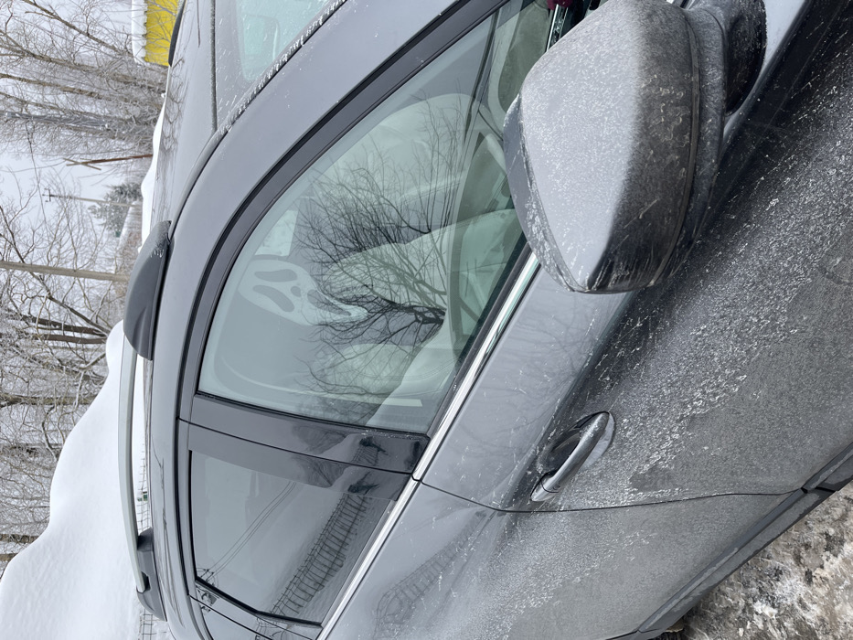 This forensic description details a winter scene in Shevlyakovo, Russia. A dark grey SUV, coated in dirty, icy residue on its lower panels and side mirror, is parked outdoors. The vehicle features a silver roof rack. Through the front passenger side window, a white Ghostface mask is clearly visible, positioned upright on a light-colored seat, facing forward. The exterior environment consists of snow-covered ground and piles of snow. Bare deciduous trees, heavily coated in ice, stand in the background behind a wire fence, with an overcast sky overhead. Utility poles and power lines are visible among the trees, and a distant yellow structure is partially obscured in the upper right. No individuals are visible.