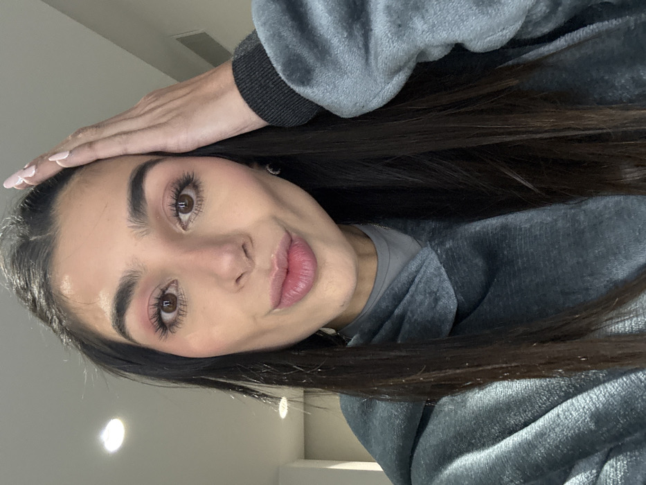 A young woman with long dark hair and light skin is posing for a selfie. She is wearing a gray sweatshirt with a dark gray cuff. Her right hand is resting on her forehead. She has brown eyes, full lips, and manicured nails. The background appears to be a room with white walls and bright lighting. The overall image has a soft and slightly tilted perspective.