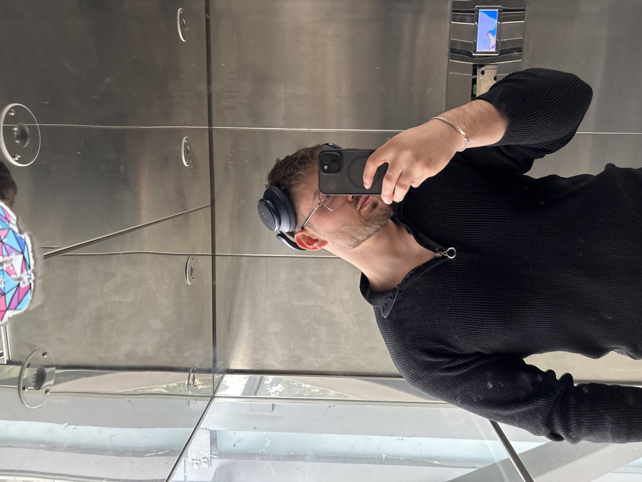 A male individual is photographed from the mid-chest up, taking a selfie in a reflective elevator. He wears a black, ribbed, quarter-zip long-sleeve shirt, round-rimmed glasses, and dark blue over-ear headphones resting atop his head. His right hand holds a black smartphone, partially obscuring his face. A silver-colored bracelet with small white elements is visible on his right wrist. The elevator interior features polished metallic panels and overhead circular light fixtures. A clear glass panel on the left reveals a blurred exterior view of greenery and structural elements. To the right, below the subject's arm, a dark panel contains an illuminated rectangular display showing blue and white graphics, indicative of an elevator control or information screen. This specific elevator design and exterior view are consistent with a glass elevator located in Paradise Center, Sofia, Bulgaria.