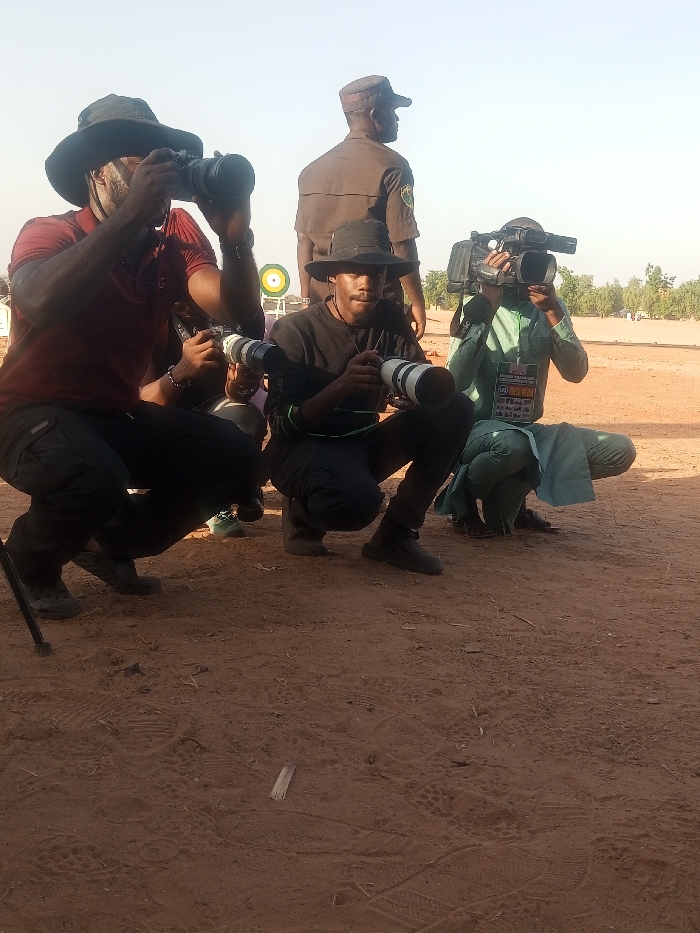 Several photographers are squatting on a dirt ground, focused on taking pictures with professional cameras. They wear hats, and casual clothing, while one person wears a green uniform and is holding a camcorder. A person in uniform stands in the background. The scene takes place in an outdoor location, possibly an event or gathering.