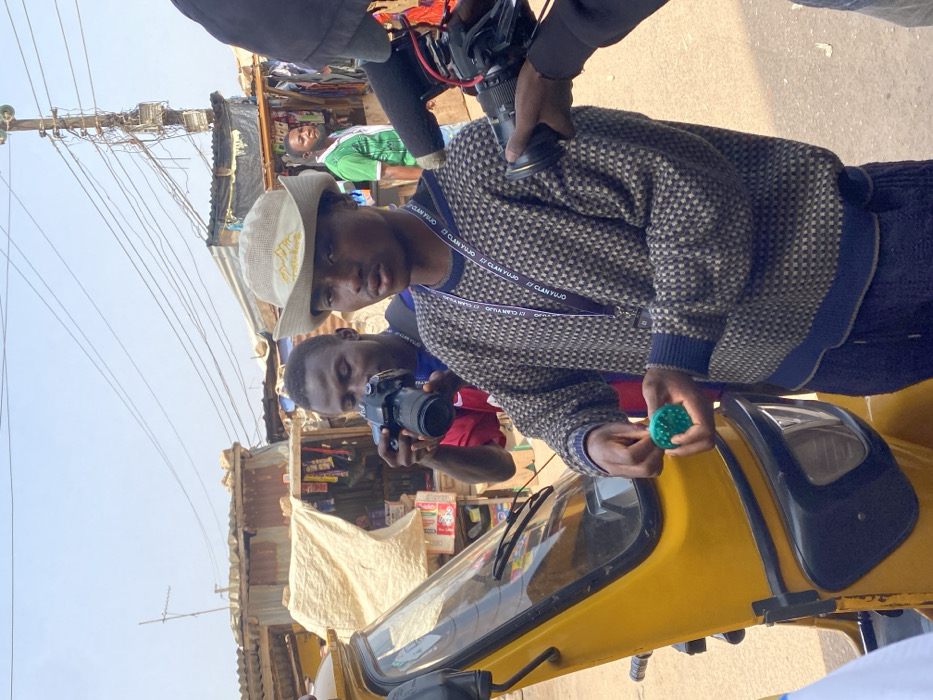 Two men are the focus of the image. One wears a knit sweater and a hat and holds a small, round, green object. The second man has a camera and seems to be taking a picture of the other man and the green object. They are beside a yellow vehicle. In the background is a crowded, outdoor market area. Several electrical poles and wires are visible.
