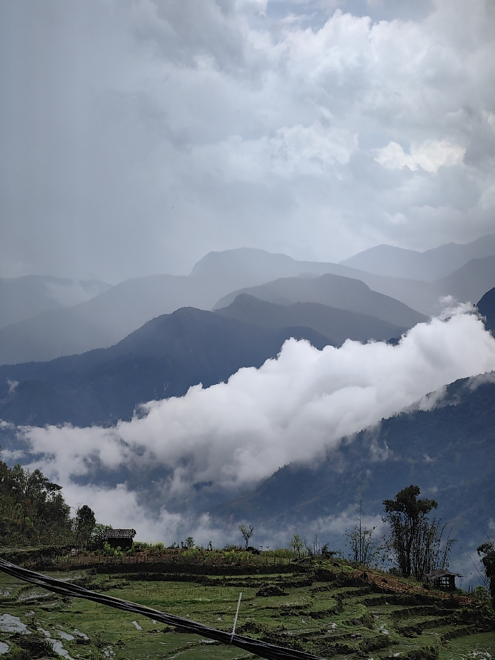 The image depicts a panoramic view of a mountainous rural landscape in Tả Van, Vietnam, under an overcast sky. Multiple layers of mountains, exhibiting atmospheric haze, recede into the background, with their peaks partially obscured by dense, light-grey cloud cover. A prominent band of white cumulus clouds horizontally traverses the mid-ground, nestled between the upper and lower mountain slopes. In the foreground and mid-ground, terraced rice paddies, largely green and appearing wet, are visible on undulating terrain. A small, dark-roofed structure, resembling a house or shed, is situated on a higher terrace towards the left side of the frame, surrounded by sparse green foliage. Further to the right, another smaller, dark structure with a sloped roof is partially visible amidst a cluster of bamboo trees. Scattered trees and shrubs dot the hillsides. A series of dark, horizontal lines, consistent with electrical wires or cables, extends across the lower portion of the image, running above the rice terraces. No individuals or active interactions are observed within the scene.