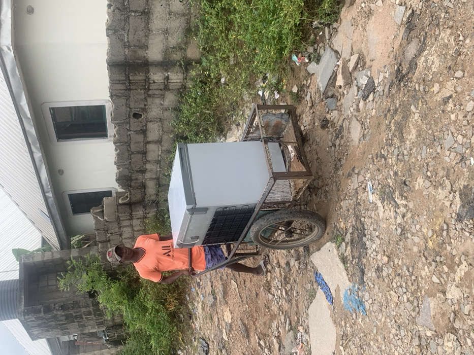 - "In Zango-ndaji, Nigeria, an adult male pushes a two-wheeled metal utility cart bearing a light gray chest freezer across an unpaved, rocky dirt path" by FM-zCpf43, licensed under CC BY 4.0