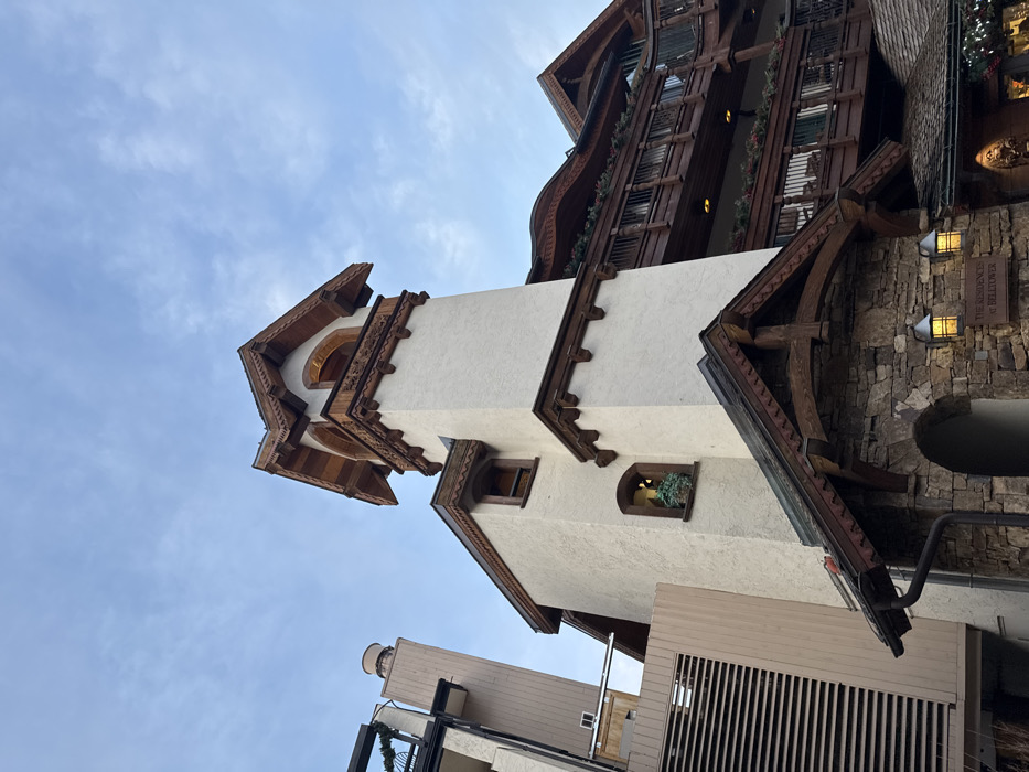 A tall, beige tower with intricate wooden trim rises against a cloudy sky. The tower is part of a larger building with multi-story balconies adorned with greenery. Architectural styles vary, with some areas featuring stone facades and arched entryways. Signage reading "The Residences at Belltower" is visible on a stone wall. Below, other buildings peek out, including a round structure with a railing.