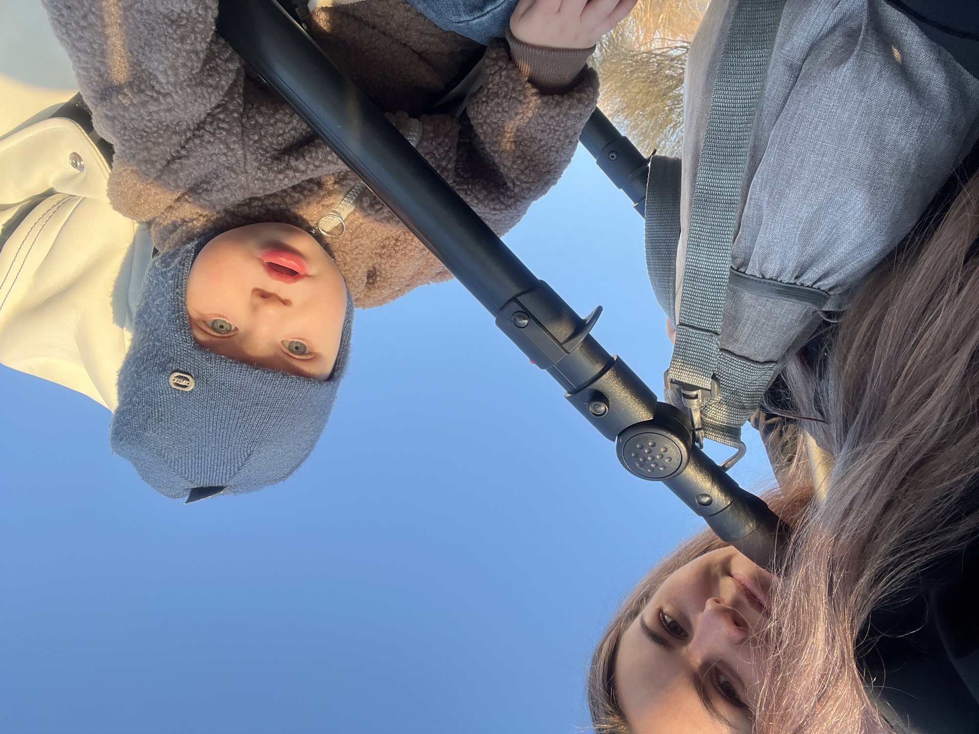 - "The image depicts a woman holding a stroller with a baby in it, from a low-angle perspective looking upwards" by FM-GY7T12, licensed under CC BY 4.0