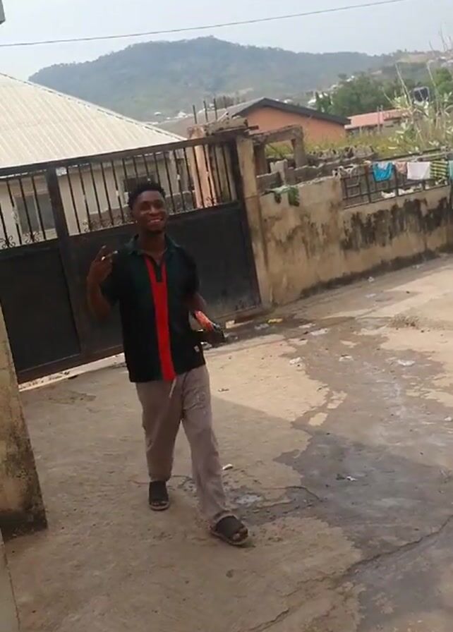 A young man walks towards the camera, smiles, and holds up a peace sign. He is wearing a black and green polo shirt with a red stripe down the middle and khaki pants. He is holding something that looks like toys in his left hand. He is standing on a concrete surface in front of a metal gate and a concrete wall. In the background, there is a mountain and some houses. Clothes are hanging on a line in the background.