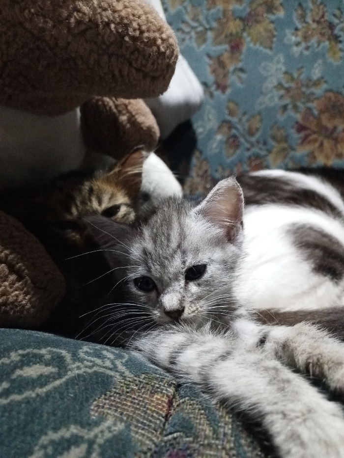 - "Two kittens are depicted resting on a patterned upholstered surface in an indoor setting in Viengkham, Laos" by FM-52KrX2, licensed under CC BY 4.0