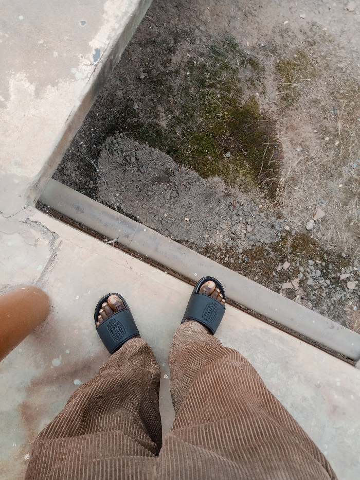 The scene, captured in Unguwan Sanusi, Nigeria, presents a downward-angle view focused on an individual's lower legs and feet. The person wears ribbed, brown corduroy trousers and black slip-on sandals, revealing dark-complexioned feet. The subject stands on a light-colored concrete surface, which exhibits minor cracks and light-colored spatters. A dark gray metallic bar or pipe runs horizontally across the midground, forming a clear demarcation between the concrete and the uneven ground below. This lower ground consists primarily of dark soil mixed with small gravel and debris, interspersed with visible patches of green moss and damp areas. A curved, light brown pipe or pole is partially visible on the left side of the concrete surface.