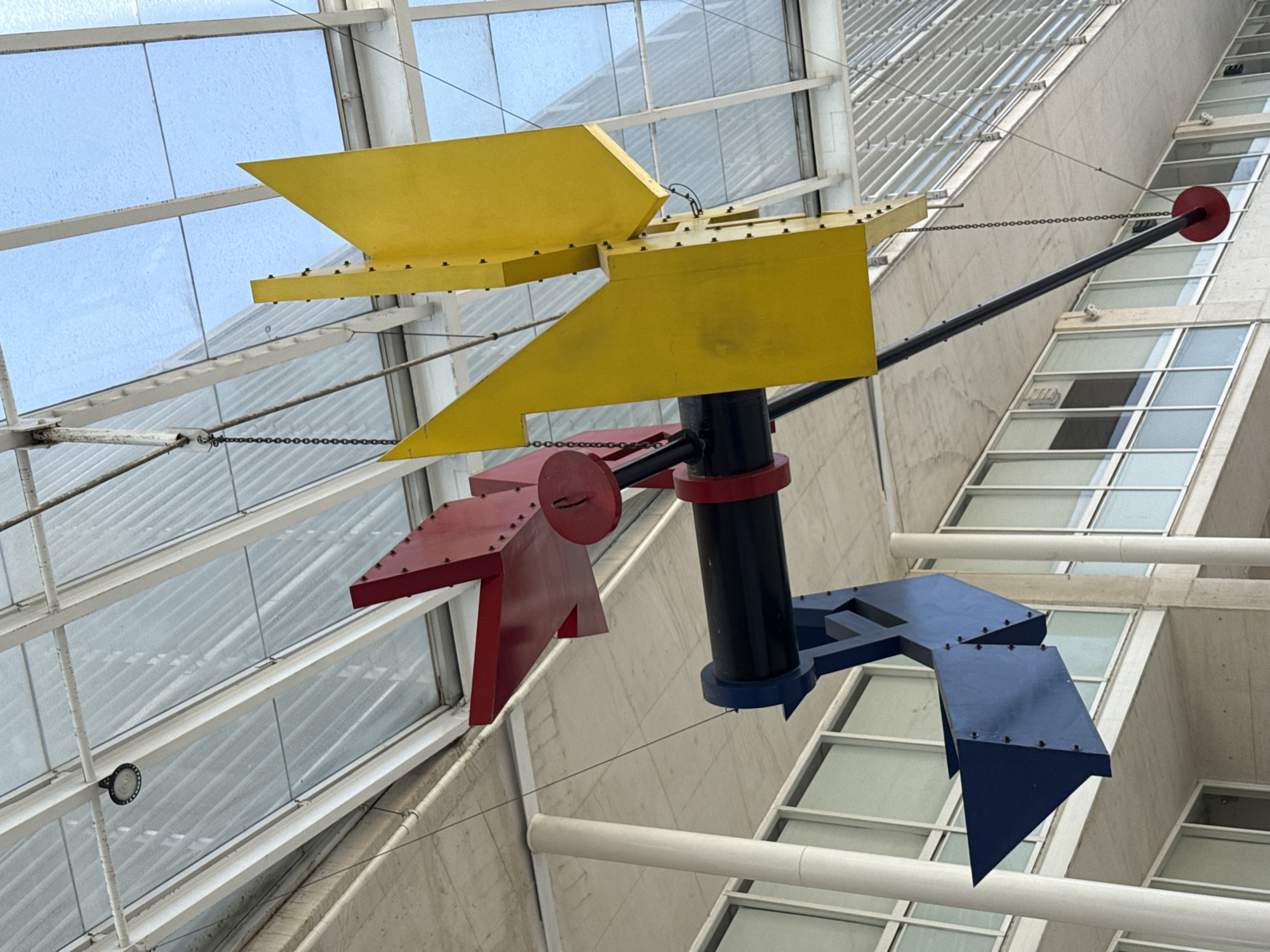 - "An abstract, geometric sculpture, predominantly red, yellow, blue, and black, is suspended from the ceiling within a modern building in Ciudad López Mateos, Mexico" by FM-avfjN2, licensed under CC BY 4.0