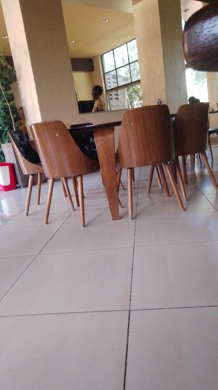 A low-angle shot shows a table with four modern chairs, three with wooden backs and one with a black cushion