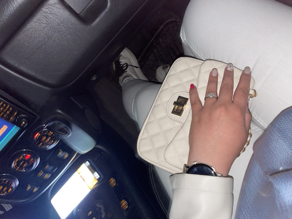 The image displays the interior of a vehicle, observed from a downward perspective, primarily focusing on the passenger seat. A single individual occupies the seat, with their lower left torso, left leg, left arm, and hand partially visible. The person is dressed in light-colored trousers and a light-colored jacket sleeve. Their left foot, adorned with a white sneaker featuring dark laces, rests in the footwell. A quilted, off-white handbag with a gold-colored rectangular clasp is positioned on the individual's lap. The person's left hand rests on the handbag, showcasing a silver-colored ring with a clear stone on the ring finger and a metallic watch with a dark face on the wrist. Fingernail polish is varied, with bright pink on the index finger and light grey/beige on the middle, ring, and pinky fingers; a small floral pattern is discernible on the pinky finger. The vehicle's dark-colored dashboard is visible, featuring multiple illuminated gauges with orange backlighting and a central display screen exhibiting a blue interface. Below these, a bright, rectangular illuminated object is present. A dark floor mat covers the footwell. The specific location in Tarnava, Bulgaria, cannot be determined from the visual information provided within the image.