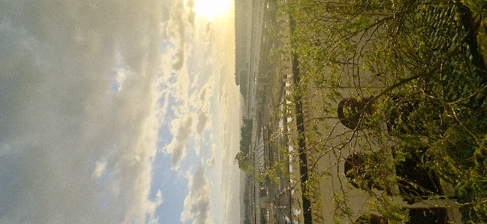 A high-angle, horizontally-oriented landscape featuring a sky with sun and scattered clouds. Distant buildings are visible in the center, with what appears to be a cityscape below. In the right foreground, tree branches obscure a portion of a building. The scene is brightly lit, giving a hazy effect to the overall image.