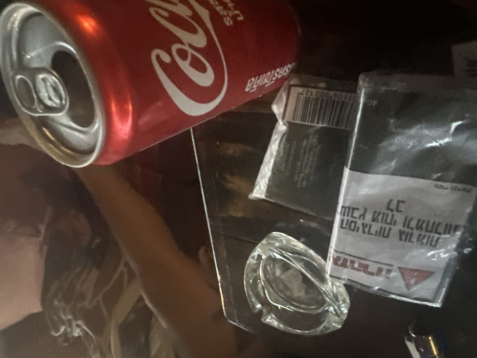 The image displays an indoor scene in the city of Ban Paem Bok, Thailand, centered on a dark, reflective surface, likely a table. A red Coca-Cola can, open with its silver tab visible, occupies the upper right portion of the frame and displays Thai script. To the left of the can, a clear glass ashtray rests on the surface, appearing empty. Adjacent to the ashtray is a black, rectangular packaged item, partially wrapped in plastic, with a visible barcode and text. Below this item and towards the bottom left, a white-labeled package, possibly containing cigarettes, is visible. This package features a red warning triangle and text in Hebrew, including the word "אזהרה" (Warning). A metallic lighter is partially visible in the bottom left corner. In the blurred background, a bare human arm and a portion of a torso are discernible in the upper left.