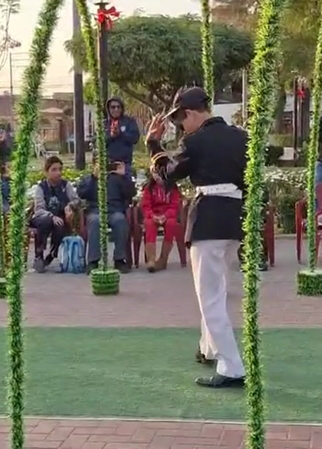 man dancing between artificial green hoops in an outdoor setting. The man is dressed in a dark blazer with a white belt and white pants, along with a hat. He appears to be performing for an audience seated on chairs on either side of him. The audience consists of adults and children, some of whom are recording the performance with their phones. The background includes trees, buildings, and a sky that suggests either sunrise or sunset. The ground is covered with brick pavers and artificial turf. The hoops are arranged in a line, creating a corridor through which the dancer moves.
