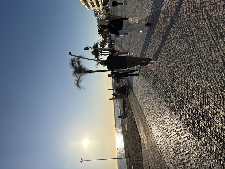 The image depicts a vibrant coastal promenade in Quarteira, Portugal, observed during late afternoon or sunset. The sky is clear blue, dominated by the bright, low-angle sun on the left horizon, casting a golden glow across the scene. On the left, the sun reflects intensely off the calm ocean surface, which borders a sandy beach. A tall, multi-bulb floodlight pole stands on the edge of the beach, silhouetted against the sun. Further out on the water, a pier or breakwater with a small structure (possibly a lighthouse) is visible in the distance. Wooden platforms or boardwalk sections are present on the beach, with several individuals seated on benches or walking near the water's edge. The foreground is dominated by a wide promenade paved with traditional Portuguese cobblestones, exhibiting strong reflections from the low sun and distinct, elongated shadows of people and objects. In the midground, numerous pedestrians are walking along the promenade. Prominently featured are a male subject walking away from the camera, wearing a dark t-shirt and olive-green pants, holding a clear plastic water bottle in his right hand. To his right, another female subject walks away, wearing light-colored pants and a dark top, carrying a white bag. To the left of the central male, another male subject in a dark blue shirt and jeans walks towards the camera. The promenade is lined on its right side by a series of palm trees and modern, curved streetlights. Beyond these, a row of multi-story buildings, likely apartments or hotels with balconies, extends into the background, characterizing the urban coastal environment. The overall scene is active, illuminated by warm, directional sunlight, highlighting the public leisure activities along the Quarteira coastline.