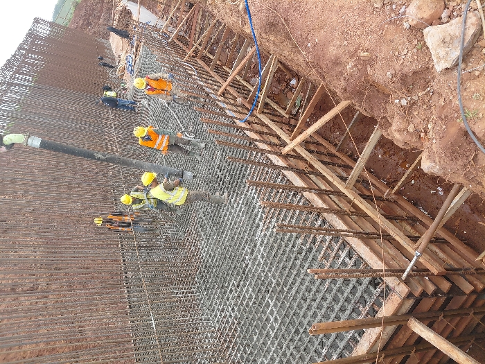 The image depicts an active construction site in Fdalate, Morocco, where concrete is being poured for a large reinforced structure, likely a foundation or retaining wall