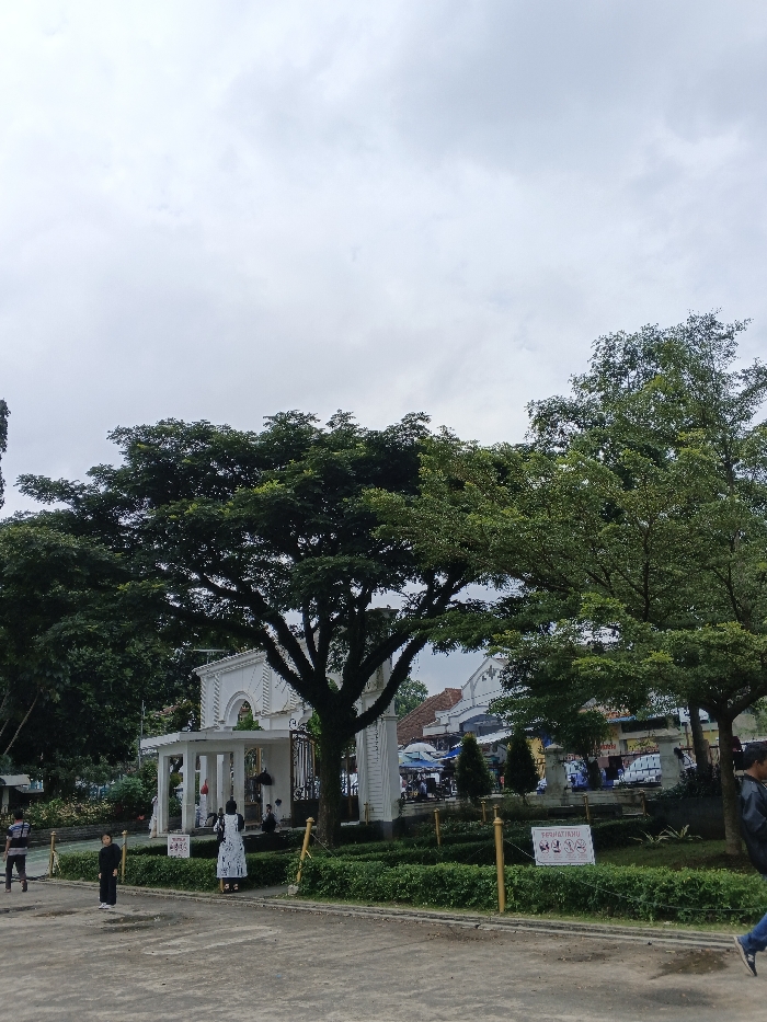 The image depicts an overcast daytime scene within a public park or square in Ho Chi Minh City, Vietnam. The sky, covering the upper half of the frame, is filled with light grey clouds. In the mid-ground, a large tree with dense, dark green foliage and a thick, multi-branched trunk dominates the left-center, situated next to a white, classical-style pavilion or gate structure. This structure features columns, an arched entrance, and a dark, ornate metal gate. To the right of this central structure, another tree with lighter green leaves is visible. The foreground consists of a grey, paved surface, likely concrete or asphalt. A landscaped area with trimmed green hedges, demarcated by golden posts and rope barriers, stretches across the mid-ground between the paved area and the structures. A white sign with red text, partially visible as "PERHATIKAN," and four red-crossed-out pictograms (indicating prohibitions such as littering, smoking, pets, and noise) is placed within these hedges on the right. Multiple individuals are present in the scene. In the left-center foreground, a person wearing a dark long-sleeved shirt and dark pants stands, facing right. Near the white pavilion in the center, a person in a long, patterned white dress stands, facing away from the camera. In the distant background on the left, a person in a striped shirt walks towards the left. On the far right, a person in a dark jacket is partially visible, moving towards the right edge of the frame. Other indistinct figures are visible around the white structure and further into the background, where additional buildings, possibly commercial establishments with colorful awnings, are present amidst more trees. The overall environment suggests a bustling public recreational area under subdued lighting conditions.