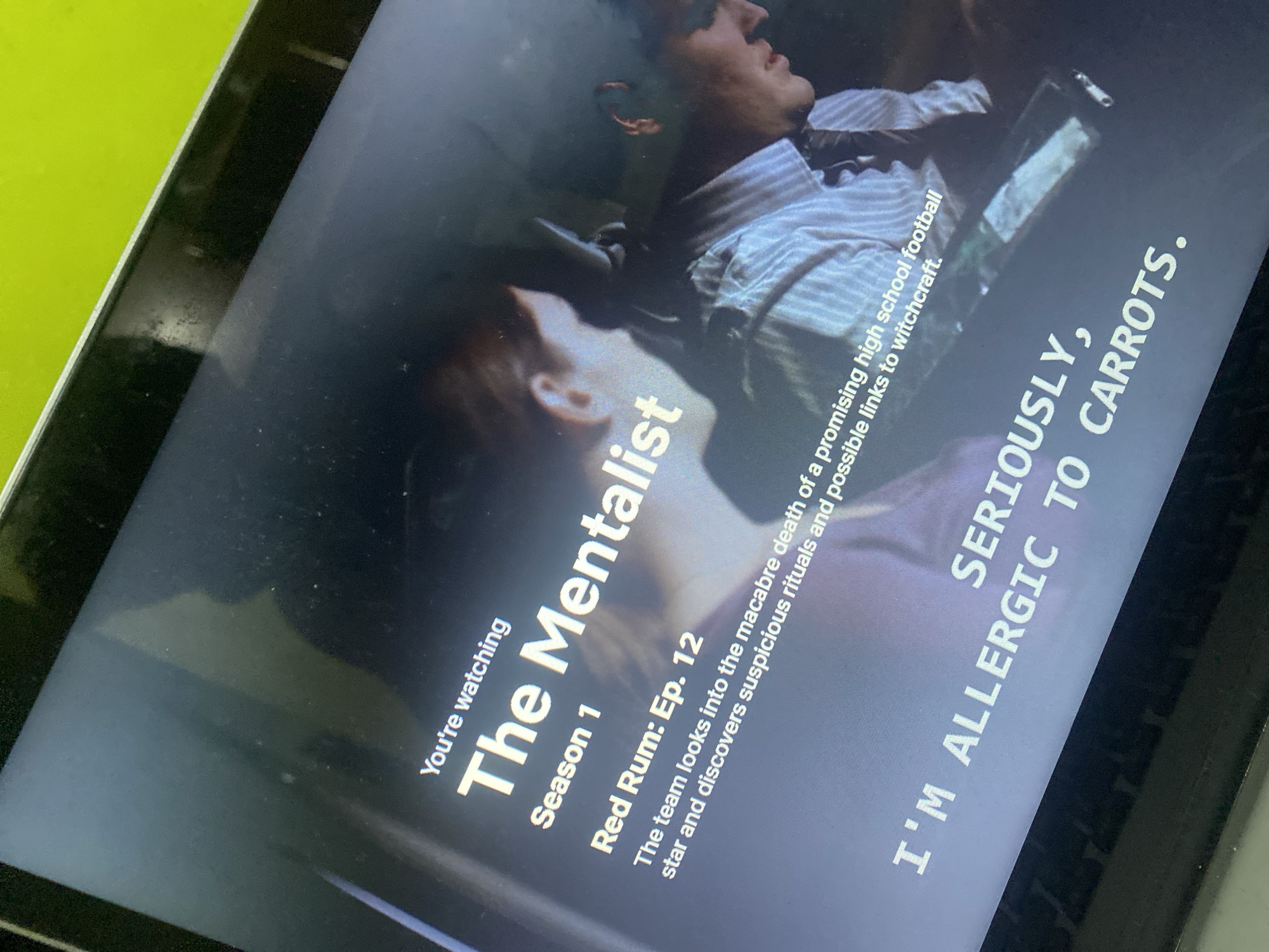 The image displays a digital screen exhibiting content from the television series "The Mentalist." The screen shows the program details: "You're watching The Mentalist Season 1 Red Rum: Ep. 12," followed by a synopsis: "The team looks into the macabre death of a promising high school football star and discovers suspicious rituals and possible links to witchcraft." Subtitle text is present at the bottom, reading: "SERIOUSLY, I'M ALLERGIC TO CARROTS." The visual scene on the screen depicts two individuals in a dimly lit environment. On the left, a person with reddish or light-colored hair is partially visible. On the right, a male subject, dressed in a light-colored striped shirt and a dark tie, has what appears to be an earpiece or headset on his right ear and is looking downwards. The screen itself exhibits reflections and specks of dust. A black bezel frames the display. In the background, a bright lime green surface is visible, suggesting the device is positioned on or near a brightly colored object or wall. There is no visual information within the image to determine its physical location within Nairobi, Kenya.