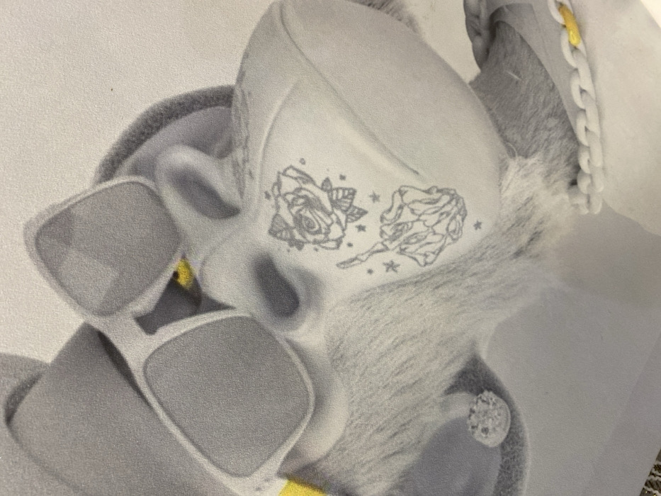 The image is a close-up of a gray stuffed animal wearing sunglasses and what appears to be a hat. Two rose tattoos are visible on the side of the animal's head. There is a chain around its neck and a possible button near the animal's ear. The photograph is primarily in shades of gray with a yellow tint in certain spots.