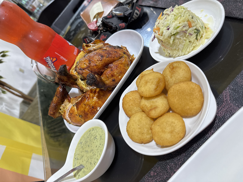 The scene depicts a meal served on a dark, reflective table, likely within an establishment in Altagracia, Venezuela. The central subject is a whole roasted chicken, portioned and presented on a white oval platter. The chicken features browned, crispy skin. To the left, a white gravy boat contains a light green, herb-based sauce, with a silver spoon resting inside. Below this, a white oval plate holds approximately eight to ten small, golden-brown fried dough items, resembling *arepitas*. Further right, a smaller white oval dish contains a serving of coleslaw, composed primarily of shredded green and purple cabbage and carrots, with a dressing visible at the bottom. A red plastic bottle of Frescolita, a Venezuelan soft drink, is positioned upright behind the chicken, its label clearly visible. In the background, to the right, personal items are visible on the table, including a set of keys or a keychain and a brown object resembling a wallet or small bag. The overall background is blurred, showing a yellow and white striped element on the left and a green, plant-like structure on the right, suggesting an indoor restaurant or dining environment. No people are visible.