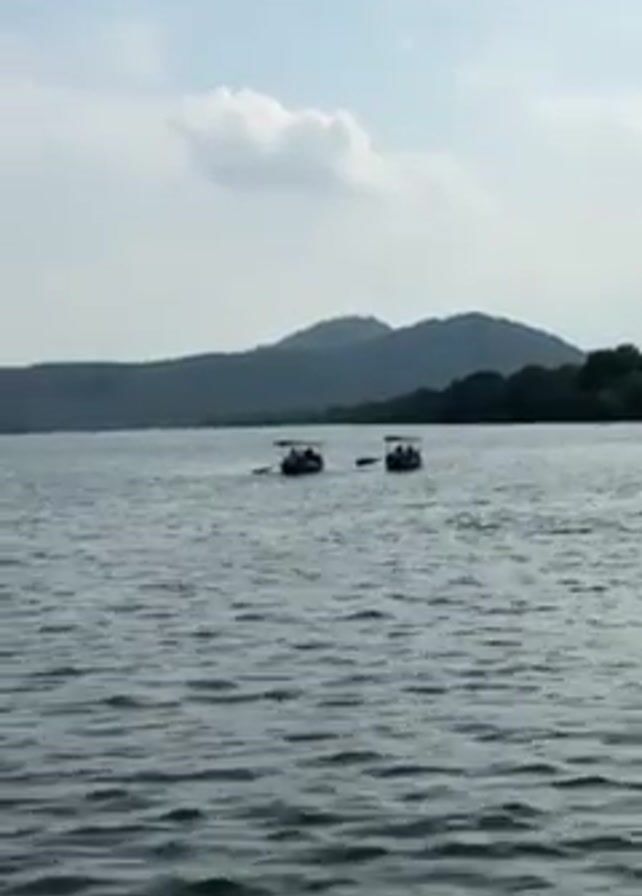 lake with multiple small boats on the water. In the background are rolling hills with trees, partially obscured by a hazy atmosphere. The sky is light blue with scattered white clouds. The boats appear to be carrying people, although the distance makes it difficult to discern exact details. The water is rippled, suggesting a slight breeze. The camera seems to be on a boat or dock, providing a stable but slightly moving perspective of the scene.