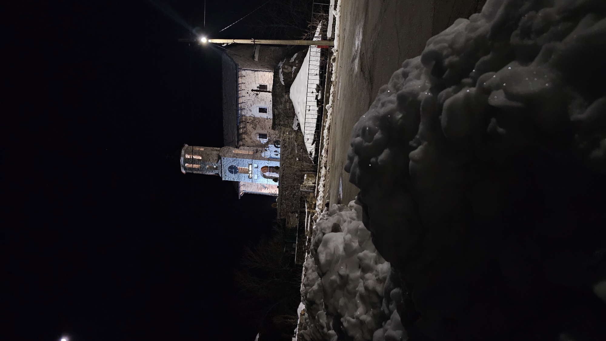 The image presents a night scene in Sitovo, Bulgaria, characterized by winter conditions and artificial illumination. In the immediate foreground, large, irregular mounds of snow dominate the lower left and extend partially across the frame. These snow piles exhibit sparkling surfaces from reflected light. An asphalt road, partially covered with snow and slush, recedes into the midground. To the right of the road, a low, dark metal fence borders a snow-covered mound. A tall utility pole with a bright streetlamp stands on the far right, casting a strong beam of light. The central subject is a stone church situated on elevated ground behind the road. The church features a multi-tiered bell tower on its left, with visible arched openings illuminated by warm, amber light from within. A clock face is discernible on the tower. The main facade, including an arched entrance, is brightly illuminated with blue light. The church is constructed of stone masonry, with a dark roof. A dark cross is positioned on the roofline to the right of the bell tower. The structure is supported by a stone retaining wall. Bare trees are visible against the dark sky on the left side, behind the church. The sky is dark, indicating nighttime. A distinct crescent moon is visible in the upper left corner of the frame, and a faint point of light, possibly a star, appears in the upper right. No individuals or discernible activities are present in the scene.