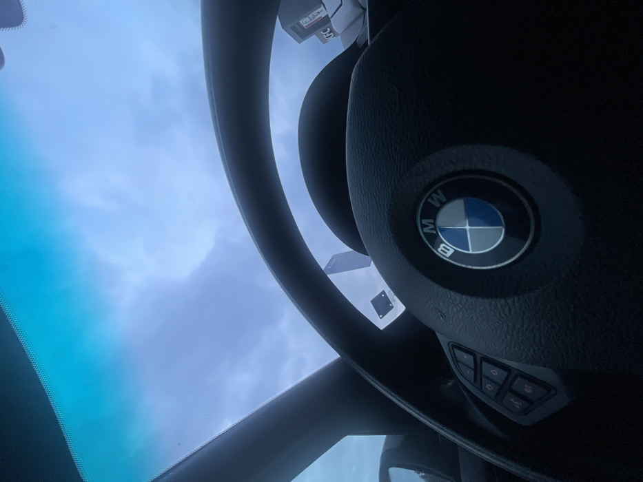 The scene is set inside a vehicle in Kalugerovo, Bulgaria, viewed through the front windshield. The primary subject is the black, multi-spoke steering wheel of a BMW, featuring the distinctive blue and white BMW logo centered on the hub. The left spoke of the steering wheel incorporates a cluster of black control buttons. Through the windshield, which has a pronounced blue-green tint across its upper portion, an overcast sky with blue-gray clouds dominates the exterior view. To the upper right, partially visible behind the steering wheel's rim, is a white commercial sign with the red "KFC" logo. Further to the left, a tall, dark, unidentifiable structural element is discernible against the sky. No individuals or active interactions are depicted within the frame.