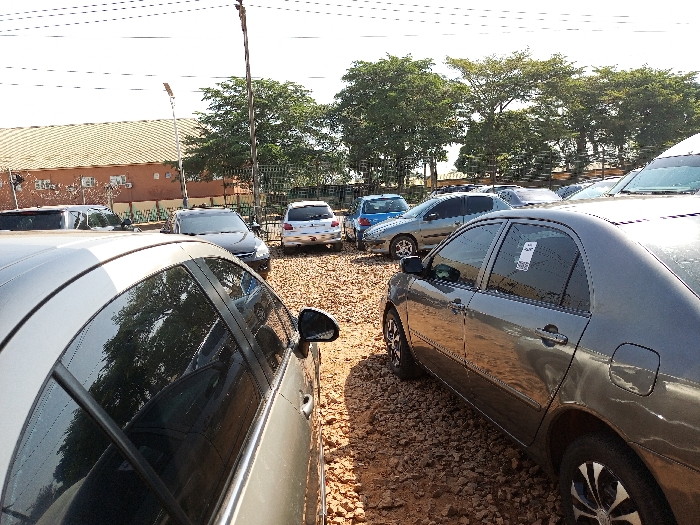 The image depicts an outdoor car park or sales lot located in Kakuri Gwari, Nigeria, under clear, bright daylight conditions. The ground surface consists of reddish-brown gravel. Numerous vehicles are parked across the scene. In the immediate foreground, a dark grey sedan is partially visible on the left. To the right, a charcoal grey sedan, featuring a white sticker on its rear passenger window, is parked facing right. Further into the lot, a variety of other sedans and utility vehicles are present in colors including silver, blue, white, and black. In the background, a building with a reddish-brown tiled roof and an orange-brown wall with a green and white patterned base is visible on the left. To the right, a dense group of mature trees with green foliage stands against a bright sky. Several tall, slender poles, appearing to be streetlights or utility poles, are positioned throughout the lot. A metal fence is discernible in the mid-ground behind some vehicles. No individuals or specific actions are visible within the frame.