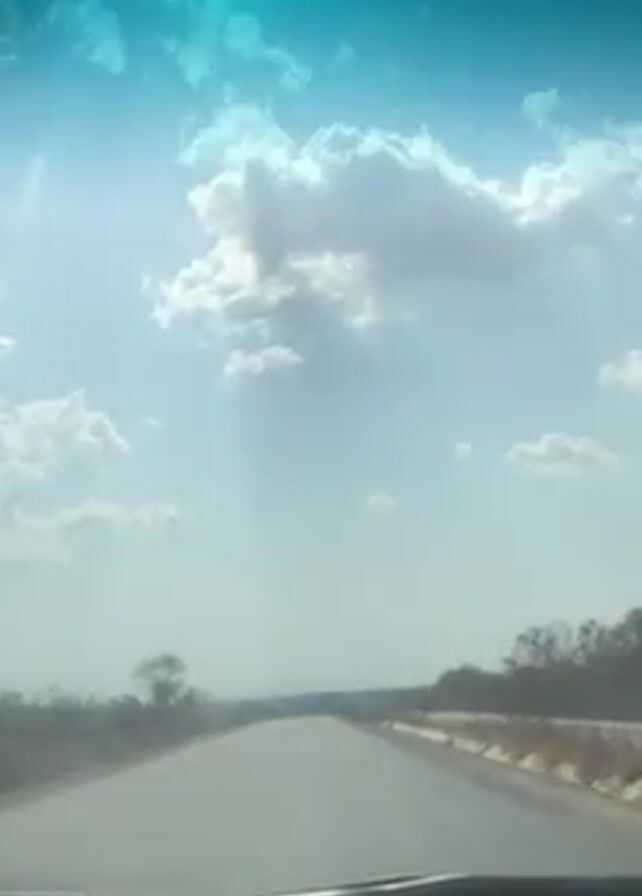 The video depicts a view from inside a vehicle driving along a paved road. The sky is bright blue with scattered white clouds. The road stretches ahead, flanked by dry, grassy terrain and sparse vegetation. The windshield has a blue tint and shows reflections. There are no other vehicles visible, but what appears to be a motorcycle is approaching in the distance on the right side of the road. A sticker of "Elizabeth Masiyiwa" is affixed to the front windshield. The overall impression is one of a sunny day on a relatively empty road.