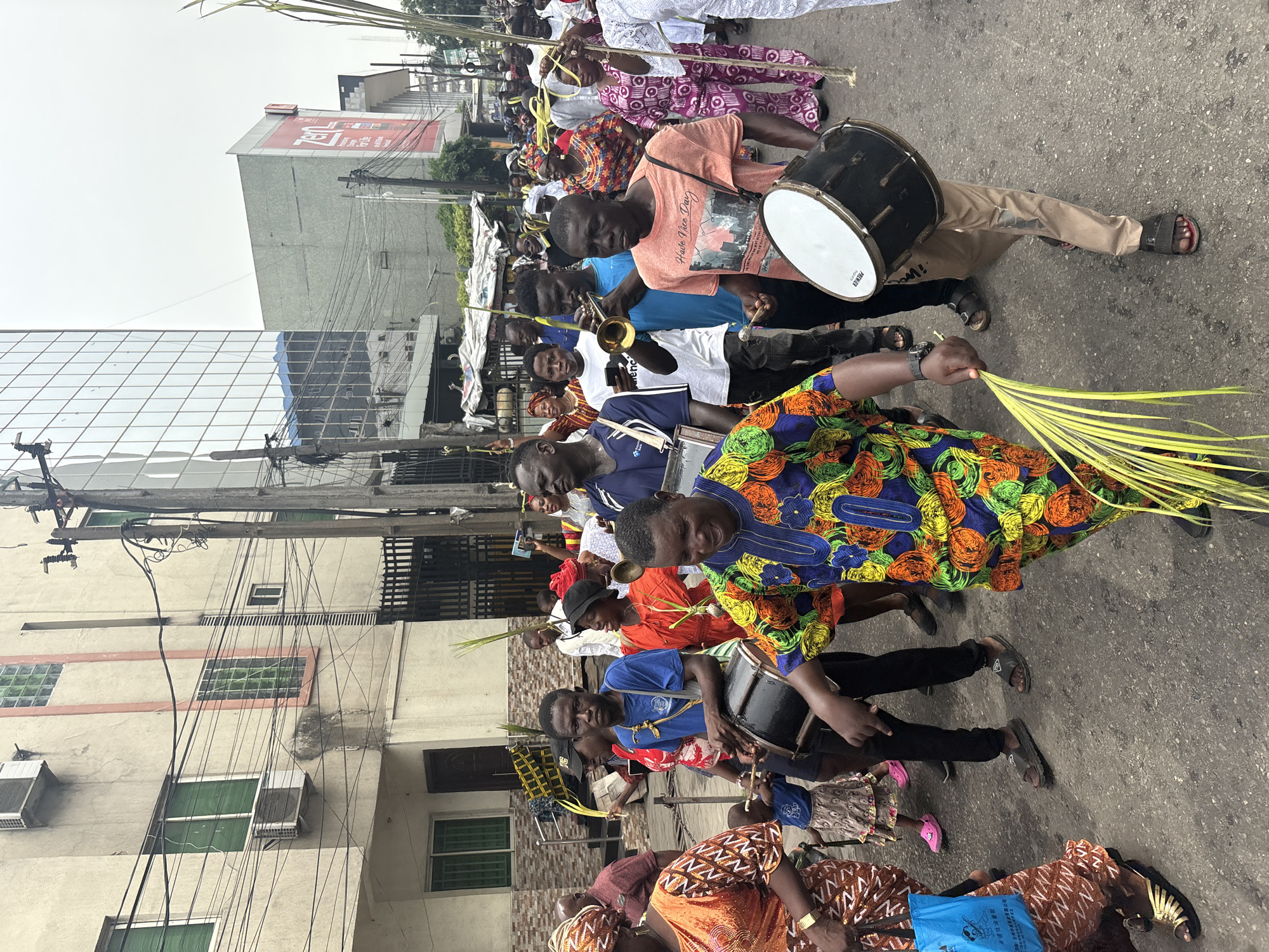 A street procession in Lagos, Nigeria, likely a Palm Sunday celebration, shows a group of people marching along a street