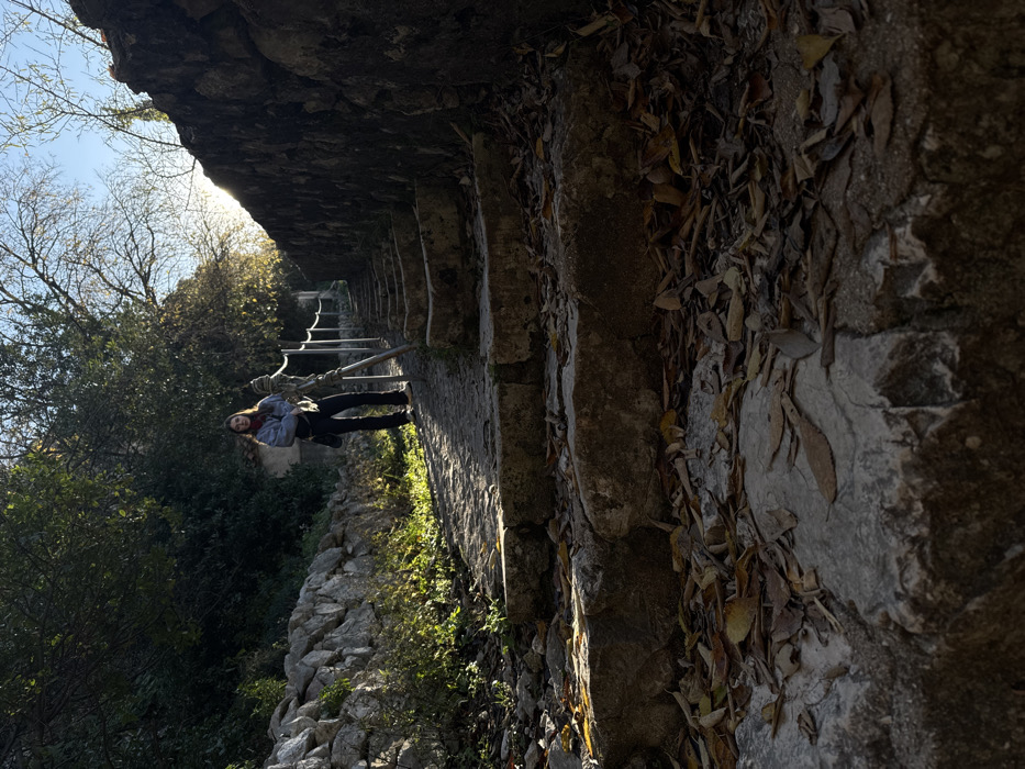 The image captures an ascending outdoor stone pathway in Kotor, Montenegro, consistent with the Ladder of Kotor leading to the San Giovanni Fortress. In the mid-ground, a female individual stands stationary on a cobblestone section of the path, slightly left of center. She wears a light grey long-sleeved top, black pants, and light-colored shoes, with a red scarf or collar visible at her neck and a dark bag slung across her body. Her long, dark hair is parted down the middle, and she looks towards the camera with a neutral expression. To her right, a simple handrail system comprises multiple metal posts connected by a rope or chain, bordering the path. The foreground features several rough-hewn stone steps partially covered with a layer of dried leaves. A low, irregular dry-stone wall with sparse vegetation borders the path on the left, while a taller, more uniform stone wall runs along the right side. Dense green foliage and trees line the left side of the path, and bare tree branches are visible against the sky on the upper right. Strong, low-angle sunlight, originating from the upper right, illuminates portions of the path and foliage, casting long shadows. The scene suggests an ancient, rugged pathway under clear conditions, likely in autumn or early winter.