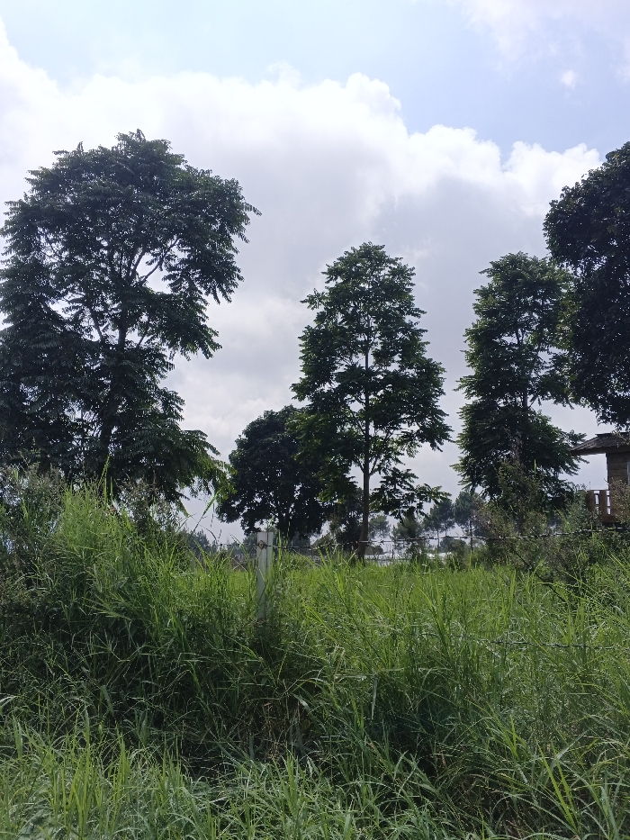The image displays an outdoor environment located in Nam Sa Lat, Myanmar. The foreground is dominated by dense, tall green grass. In the mid-ground, several mature trees with dark green, full canopies are visible, with a particularly large specimen on the left. A light-colored vertical post is partially visible within the grass in the left-center mid-ground. To the far right, a segment of a multi-level structure with a brown exterior and a dark roof or balcony detail is discernible behind intervening foliage. A faint line of what appears to be a fence with posts runs horizontally through the mid-ground, partially obscured. In the background, a line of smaller, slender trees is visible against the distant horizon. The sky is partially covered by large white and grey cumulus clouds, with patches of lighter blue sky. No individuals or specific activities are observed.