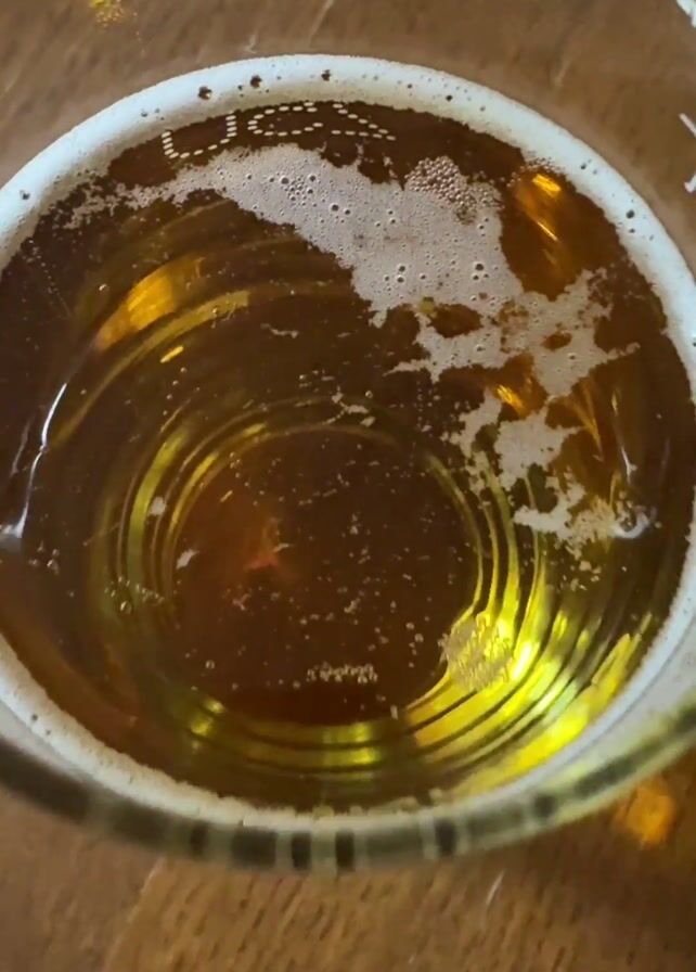A close up shows a half-full glass of light yellow beer with a small head, resting on a wooden table