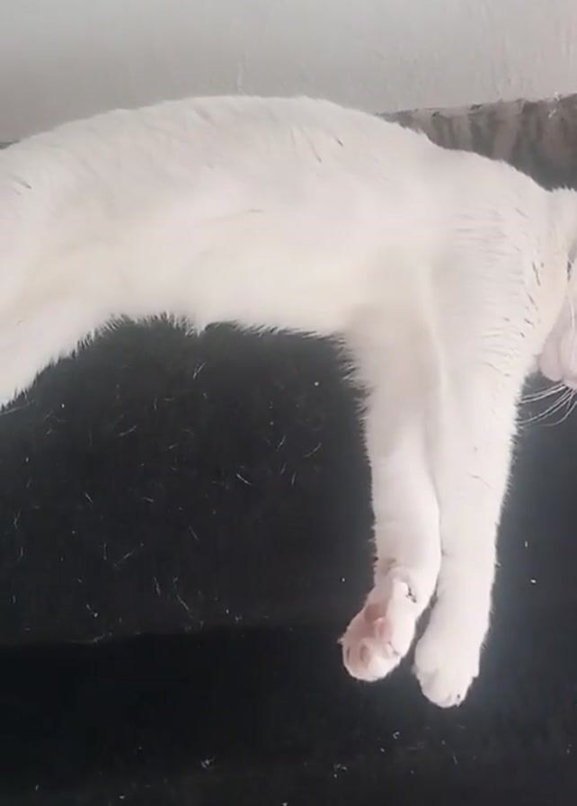 two cats napping. First, a white cat is lying down on a black surface. Then, the camera moves to show a black cat lying on a red surface.