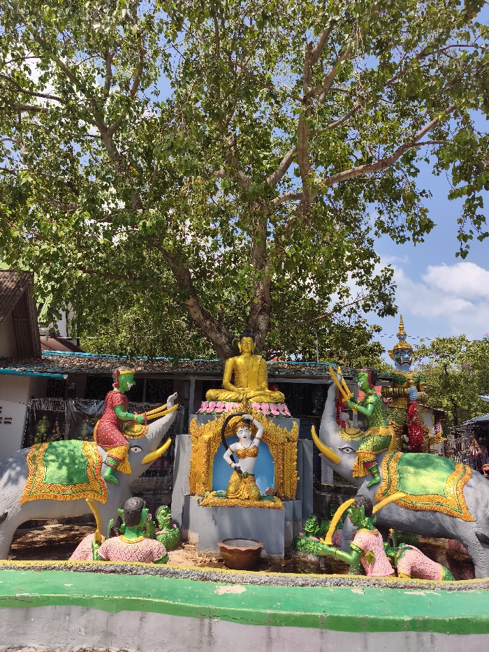A vibrant outdoor scene showcases a cluster of ornate Buddhist statues beneath a large tree