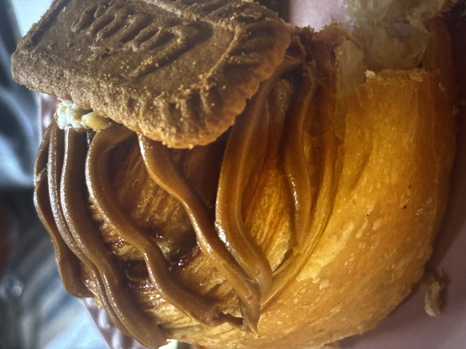 A close-up shot depicts a croissant filled with a creamy, brown spread. On top, a Lotus Biscoff cookie rests. The filling appears to be piped in thick lines, contrasting with the flaky texture of the croissant. The cookie's embossed details are visible. The pastry exhibits a golden-brown, slightly glistening surface.