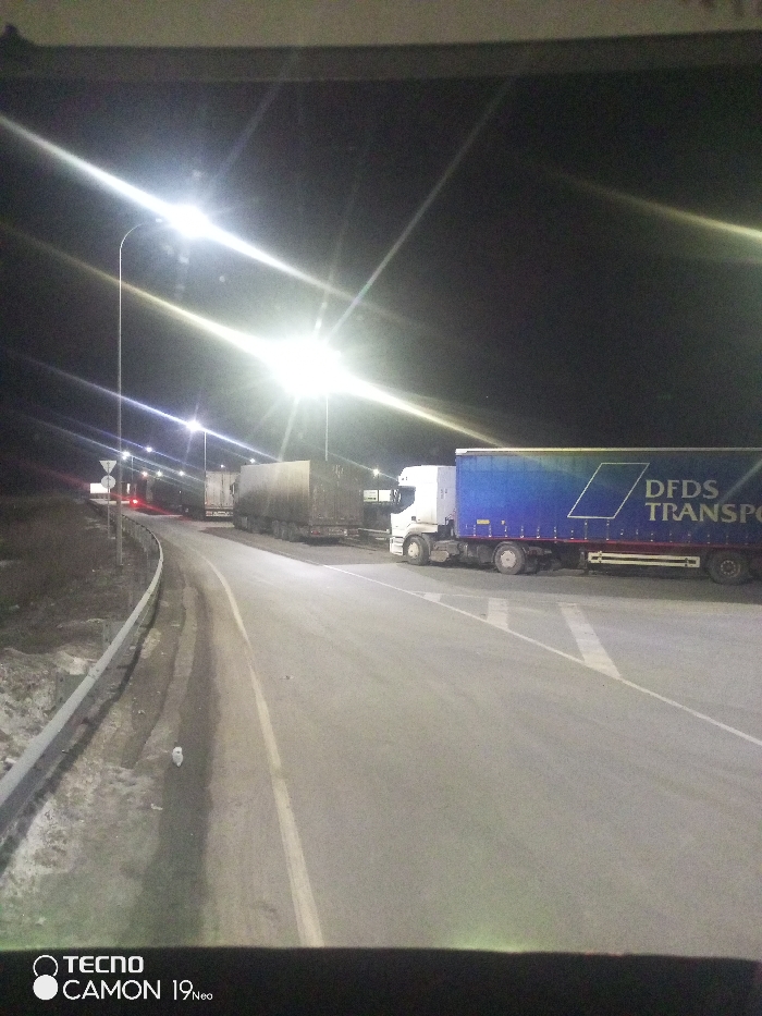 A nocturnal scene depicts a roadway in Pridorozhnyi, Russia, illuminated by multiple bright streetlights on tall poles, generating significant lens flare. The image is captured from a vehicle's interior, showing a dark dashboard at the bottom. Several semi-trailer trucks are visible on or adjacent to the asphalt road. In the foreground, on the right, a white-cabbed truck with a blue trailer bearing the white "DFDS TRANSPO" (likely "DFDS TRANSPORT") branding and a geometric logo is prominently positioned, seemingly stationary or turning. Behind it and further left, other trucks, mostly dark or covered in dirt, are observed. A guardrail runs along the left edge of the road, paralleling a barren, dry embankment. Multiple indistinct road signs on poles are visible near the guardrail. The road surface appears dry, and the sky is dark. No individuals are discernible.