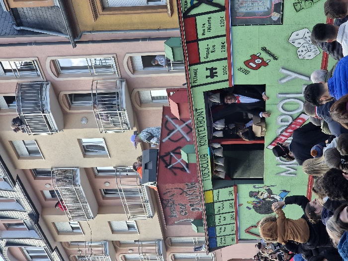- "The image depicts a crowded street scene in Pétange, Luxembourg, focused on a large, Monopoly-themed parade float during a daytime event" by FM-VH5CK2, licensed under CC BY 4.0