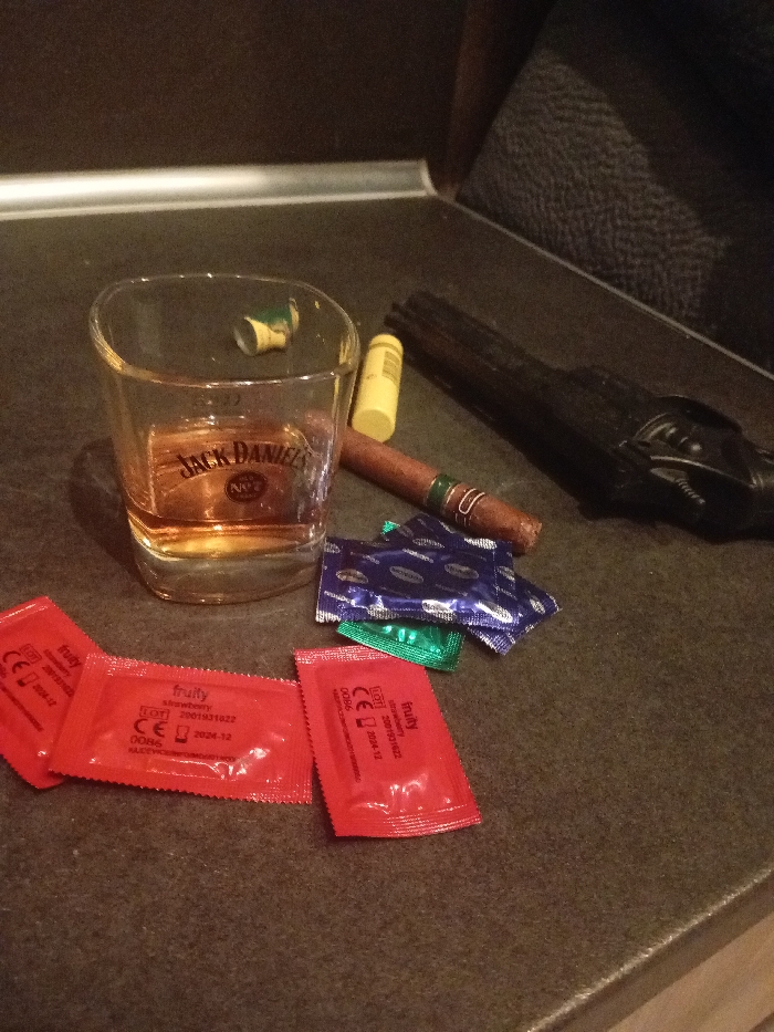 A private residence or hotel room in Sofia, Bulgaria, displays a collection of items on a dark, mottled countertop surface. In the foreground, a clear glass tumbler branded "JACK DANIEL'S OLD NO. 7" contains approximately 50ml of amber liquid and a crumpled green and beige metallic foil object. To the right of the glass, an unlit, partially consumed cigar with a dark brown wrapper and a green and gold band lies horizontally. Adjacent to the cigar, a yellow cylindrical object, possibly a lip balm stick or a small lighter, stands upright. Further right, a dark-colored handgun, appearing to be a revolver with a textured grip, rests diagonally. Arranged on the countertop, primarily to the left and center, are multiple foil-packaged condoms. Three red packets, labeled "fruity strawberry" with CE 0086 certification and a 2024-12 expiration date, are prominently displayed. A small stack of blue foil packets, partially obscured but with "MODOMA" branding visible on the top packet, sits near the cigar. One green foil packet is partially visible beneath the blue stack. The background reveals a narrow metallic strip running horizontally, above which is a uniform dark surface. To the right, a dark, textured, possibly upholstered, surface of furniture is visible. No individuals are present.